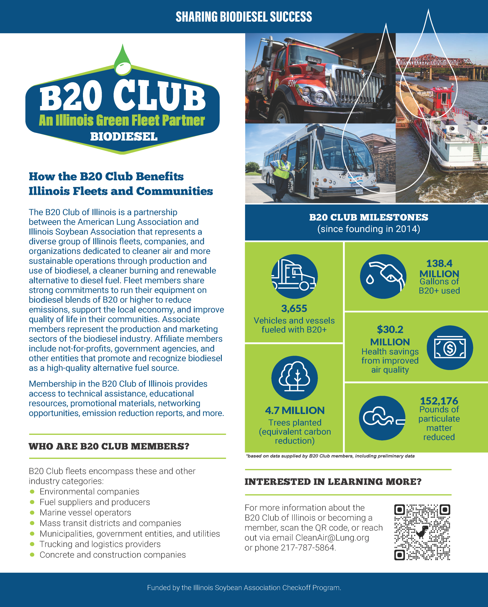 Founded in 2014, the B20 Club of Illinois is a program operated by the American Lung Association that recognizes and supports Illinois fleets and organizations with strong support for the use and production of B20 and higher blends of biodiesel. We partner with fleet operators, biofuel producers, fuel marketers, OEMs, and stakeholders to promote and advance the use of drop-in, low-carbon biodiesel, renewable diesel, and sustainable aviation fuel.